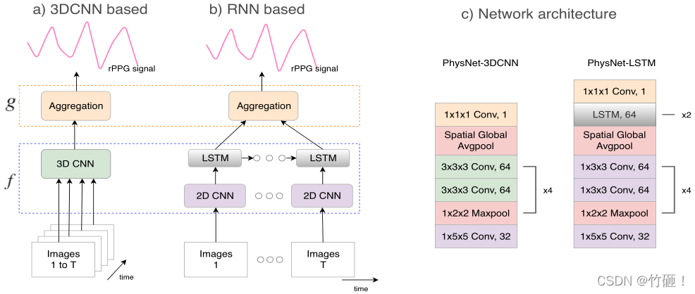 a)基于3DCNN的PhysNet;b)基于RNN的PhysNet;c)它们对应的网络架构。
