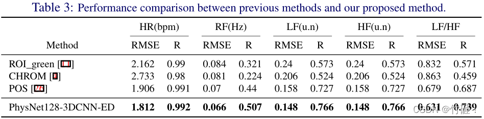 与之前的三种方法ROI_green、CHROM、POS比较。性能最佳的是PhysNet128-3DCNN-ED,它在HR和HRV水平上优于所有比较方法。