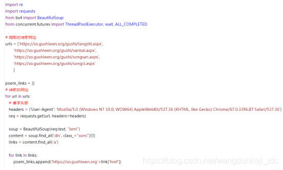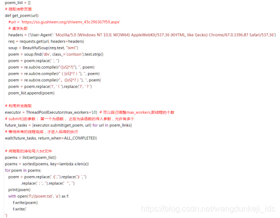由于本文主要为试了展示该项目的思路,因此,只爬取了该页面中的唐诗三百首、古诗三百、宋词三百、宋词精选,一共大约1100多首诗歌。为了加速爬虫,采用并发实现爬虫,并保存到poem.txt文件。完整的Python程序如下: