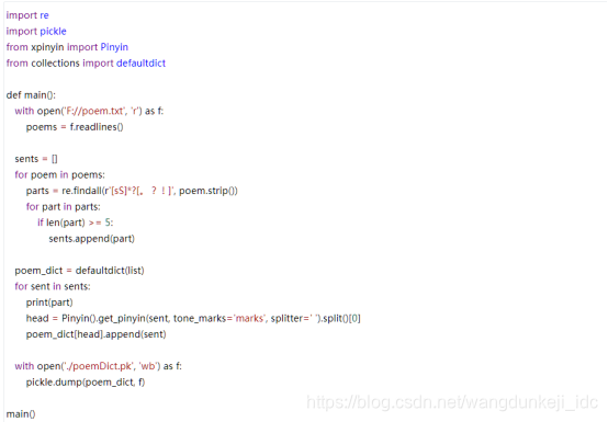 有了诗歌语料库,我们需要对诗歌进行分句,分句的标准为:按照结尾为。?!进行分句,这可以用正则表达式实现。之后,将分句好的诗歌写成字典:键(key)为该句首字的拼音,值(value)为该拼音对应的诗句,并将字典保存为pickle文件。完整的Python代码如下: