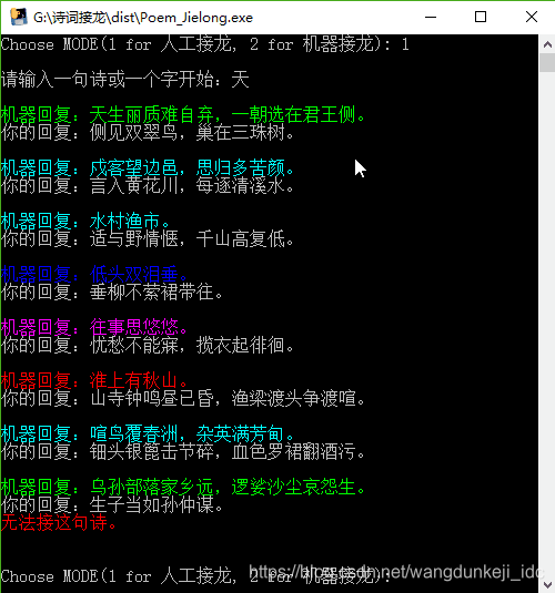 本项目的诗歌接龙有两种模式,一种为人工接龙,就是你先输入一句诗或一个字,然后就是计算机回复一句,你回复一句,负责诗歌接龙的规则;另一种模式为机器接龙,就是你先输入一句诗或一个字,机器会自动输出后面的接龙诗句(最多10个)。 先测试人工接龙模式: