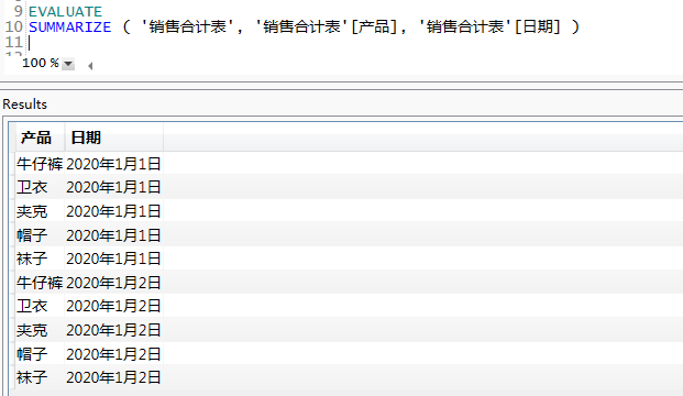 SUMMARIZE ( '销售合计表', '销售合计表'[产品], '销售合计表'[日期] )--SQL