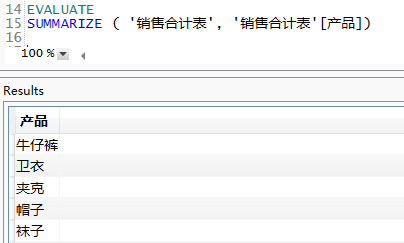 SUMMARIZE ( '销售合计表', '销售合计表'[产品])--SQL