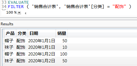 FILTER ( '销售合计表', '销售合计表'[分类] = "配饰" )--SQL