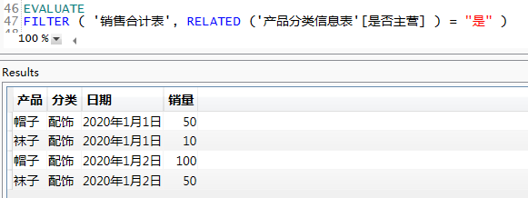 FILTER ( '销售合计表', RELATED ('产品分类信息表'[是否主营] ) = "是" )--SQL