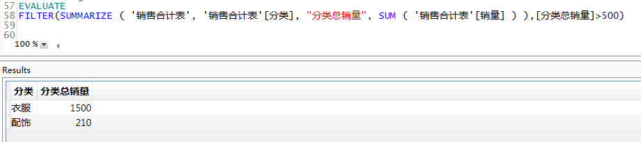 FILTER(SUMMARIZE ( '销售合计表', '销售合计表'[分类], "分类总销量", SUM ( '销售合计表'[销量] ) ),[分类总销量]>500)--SQL