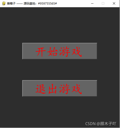 def startInterface(screen, cfg):screen.fill(cfg.BACKGROUNDCOLOR)clock = pygame.time.Clock()while True:button_1 = Button(screen, (95, 150), '开始游戏', cfg)button_2 = Button(screen, (95, 305), '退出游戏', cfg)for event in pygame.event.get():if event.type == pygame.QUIT:pygame.quit()sys.exit()if event.type == pygame.MOUSEBUTTONDOWN:if button_1.collidepoint(pygame.mouse.get_pos()):returnelif button_2.collidepoint(pygame.mouse.get_pos()):pygame.quit()sys.exit(0)clock.tick(60)pygame.display.update()def endInterface(screen, cfg):screen.fill(cfg.BACKGROUNDCOLOR)clock = pygame.time.Clock()font_path = os.path.join(cfg.FONTDIR, 'simkai.ttf')text = '机智如你~恭喜通关!'font = pygame.font.Font(font_path, 30)text_render = font.render(text, 1, (255, 255, 255))while True:for event in pygame.event.get():if event.type == pygame.QUIT:pygame.quit()sys.exit()screen.blit(text_render, (120, 200))clock.tick(60)pygame.display.update()