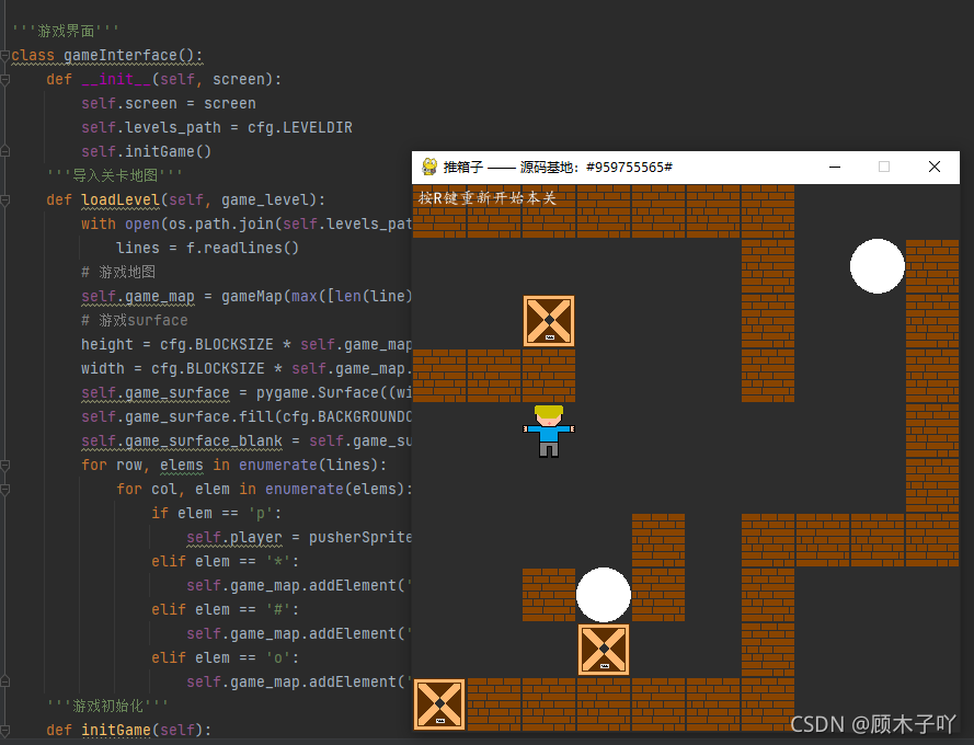 class gameInterface():def __init__(self, screen):self.screen = screenself.levels_path = cfg.LEVELDIRself.initGame()def loadLevel(self, game_level):with open(os.path.join(self.levels_path, game_level), 'r') as f:lines = f.readlines()# 游戏地图self.game_map = gameMap(max([len(line) for line in lines]) - 1, len(lines))# 游戏surfaceheight = cfg.BLOCKSIZE * self.game_map.num_rowswidth = cfg.BLOCKSIZE * self.game_map.num_colsself.game_surface = pygame.Surface((width, height))self.game_surface.fill(cfg.BACKGROUNDCOLOR)self.game_surface_blank = self.game_surface.copy()for row, elems in enumerate(lines):for col, elem in enumerate(elems):if elem == 'p':self.player = pusherSprite(col, row, cfg)elif elem == '*':self.game_map.addElement('wall', col, row)elif elem == '#':self.game_map.addElement('box', col, row)elif elem == 'o':self.game_map.addElement('target', col, row)