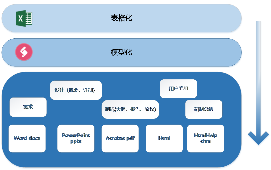 (1)文档模型化,对文档要素建模,统一管理和处理过程。模型表格化,尽可能使得用户可用Excel录入。
