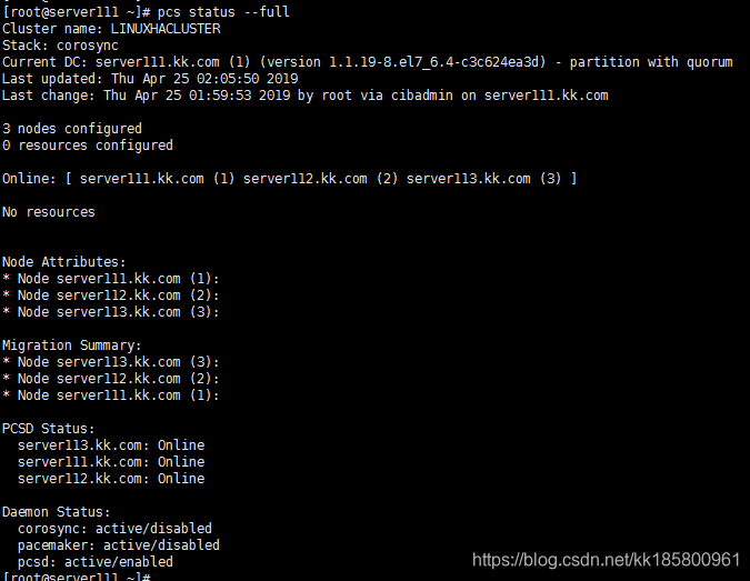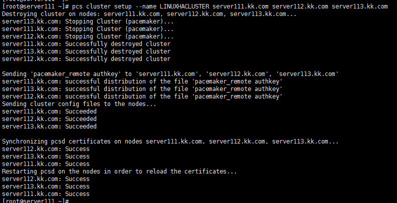 pcs cluster setup --name LINUXHACLUSTER server111.kk.com server112.kk.com server113.kk.com