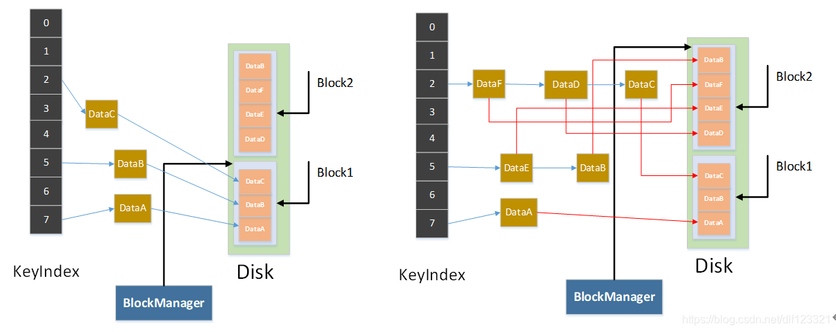 如上图二,我们没有任何数据索引。可是我们有BlockManager的索引,(前面每次下刷数据,回收block的时候,blockmanager的数据都会落盘)我们按照block生成的顺序从最早到最近依次遍历所有的block就能把数据索引反向补充回来。