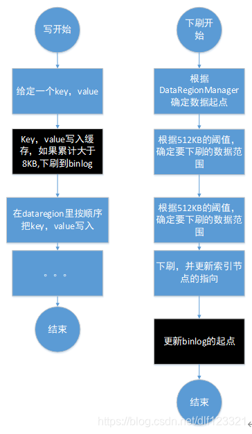 刚才提到在dataregion里面的数据还没有下刷,都在内存里,断电自然就没有了。那么,咱们就把它们也放到磁盘里。写内存之前,就先放到磁盘里。也就是所谓的WAL(Write Ahead Log)。具体什么流程呢?如下图四的左半部分,就是数据在写入dataregion之前,就先写入缓存,如果缓存里面的数据大于8KB,就下刷到磁盘里的binlog文件里。 (这个文件在mysql里面叫redo log)