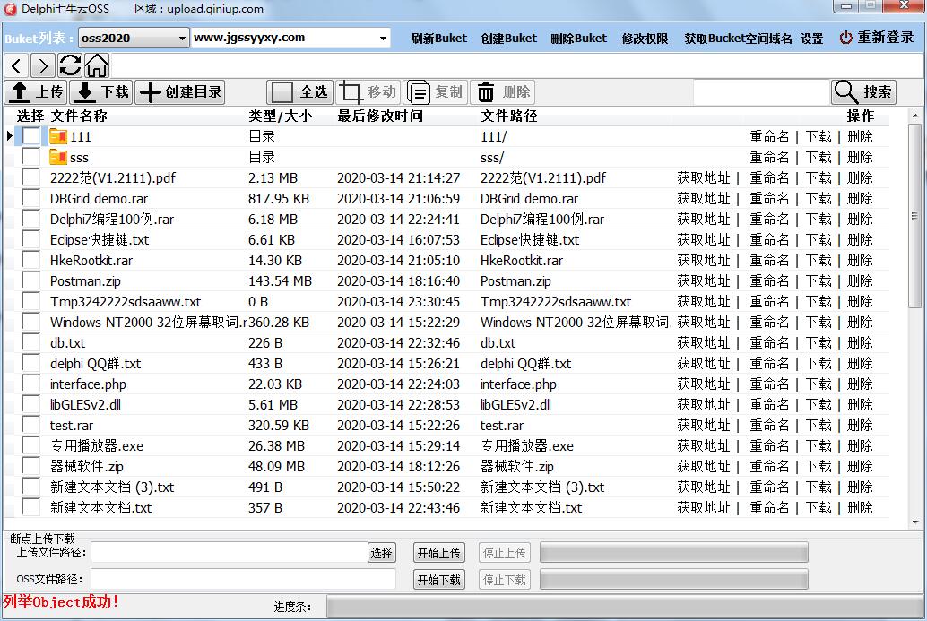 【delphi七牛云对象存储OSS】获取Bucket列表、设置Bucket权限、创建Bucket、删除Bucket、获取文件列表、上传文件、分片上传文件、下载文件、断点上传下载、复制文件、移动文件、删除文件、创建目录、删除目录等功能。
