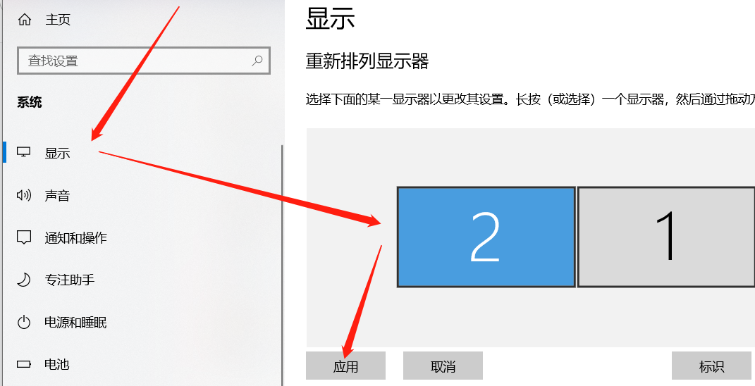 设置-系统-显示-重新排列显示器-拖动显示器1或2-应用