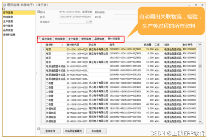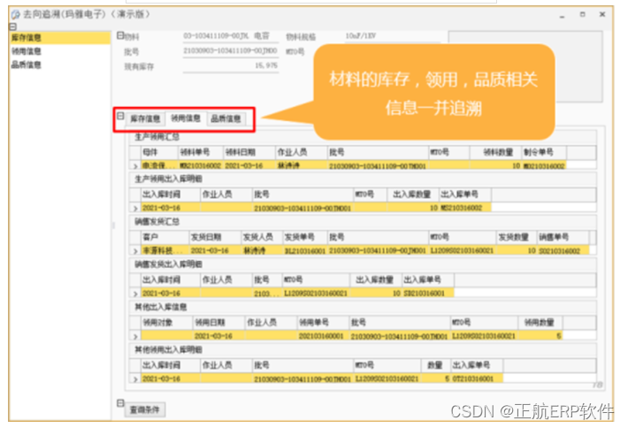 此外,ERP系统提供去向追溯,引起异常的原材料关联信息可以一键调出,帮助企业及时追溯物料去向,及时、精准地批次召回有品质异常问题的产品。