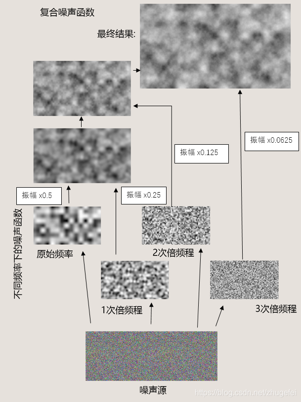 getDensity决定了云的形状,一般通过噪声贴图来实现,但由于我们不使用任何纹理,所以可以通过噪声函数来生成,普通的噪声离散性较强,与云的形状不符合,我们采用分数噪声函数来生成云的形状,其基本原理如下图所示: