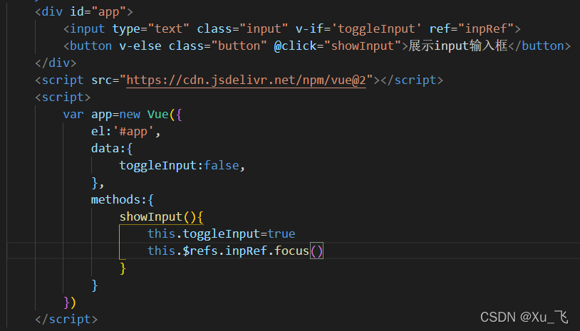 之所以会报错其实是因为一开始我们的页面中是没有文本框input属性的,当点击按钮后此时会改变 toggleInput 的值来切换input标签的显示状态,当data中的值发生改变后会立即触发DOM结构的更新,指的一提的是此时DOM并没有真正的渲染完成,所以在紧接着执行this.$refs.inpRef.focus() 这行代码的时候便会找不到相应的DOM从而无法获取焦点。
