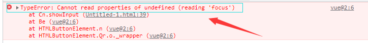 在页面中有一个文本框和一个按钮,我们希望通过点击按钮后改变 toggleInput 的布尔值来切换文本框的显示状态并且自动让文本框获得焦点。但是在你执行代码的时候会发现文本框可以正常的显示出来却不能自动获得焦点,并且会报错,如图:
