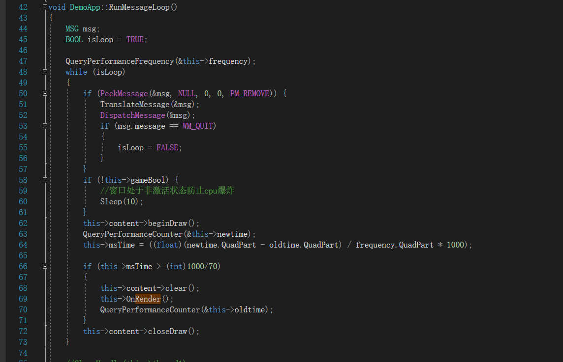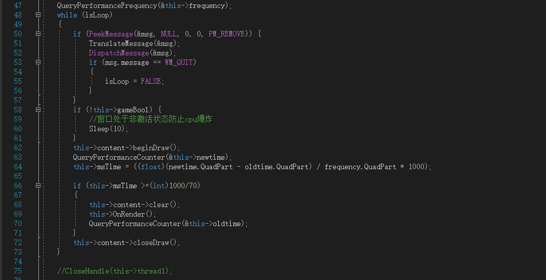 我们将传统的消息获取函数(GetMessage)替换为了peekmessage这两个函数的区别是getmessage是阻塞的一个方法,peekmessage是一个非阻塞的方法相当于我们的这里是一个死循环但是又因为d2d的封装beginDraw和closeDrow里面有一个渲染间隔的进程休眠(有可能并不是sleep有可能是其他的阻塞办法反正这里就神奇的没有让cpu暴涨了所以我们这里说d2d有一个进程休眠)所以这里的死循环不会导致cpu的暴涨。