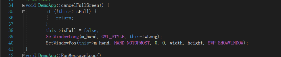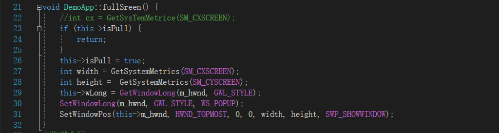 这里先判断当前窗口是否处于全屏如果是的话就直接返回如果不是就获取当前设备的宽度与高度并采用win32的api设置窗口样式