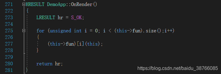 我们先在入口函数(winmain)里面实例化一个DemoApp对象然后我们将我们定义的帧函数frame1新增到demoapp的函数数组里面