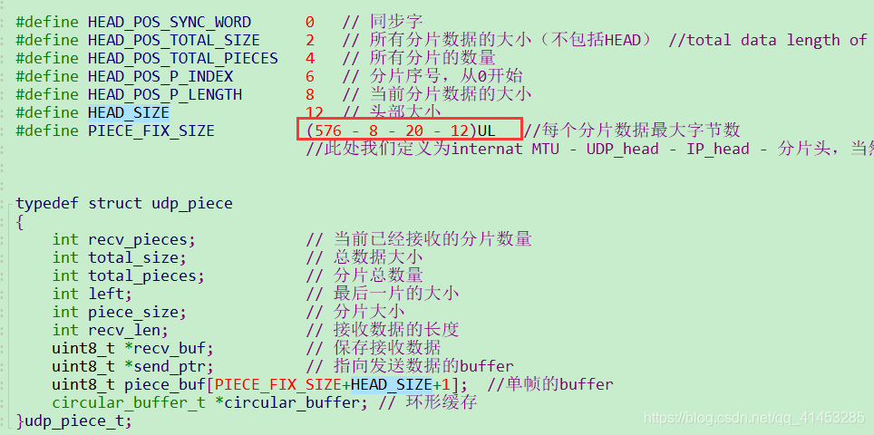 - 其中比较重要的一个字段为PIECE_FIX_SIZE,其代表我们分片中实际数据的长度,因为Internet中MTU的大小通常为576,所以我们的UDP数据包最好不要超过576-8-20大小(8为UDP头大小,20位IP报文大小),另外还要减去12(因为我们分片也有头,为12字节)