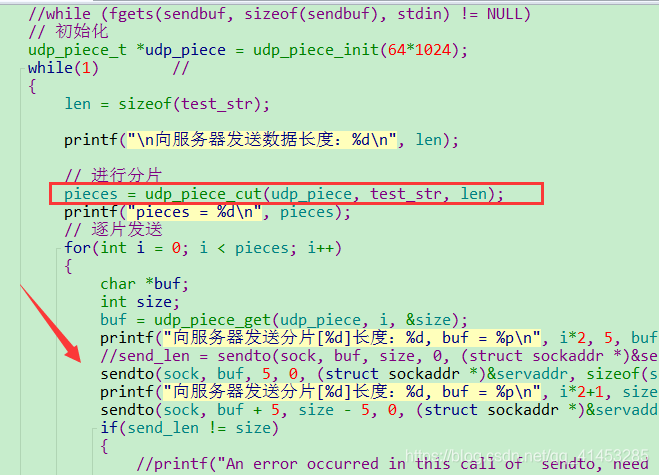 - udp-piece-client.c:其向服务端发送一长串字符串,在发送之前先调用udp_piece_cut()对整个UDP数据包进行分片,然后逐个发送出去
