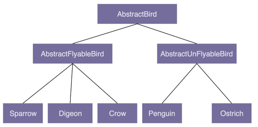 方案:再通过 AbstractBird 类派生出两个更加细分的抽象类:会飞的鸟类 AbstractFlyableBird 和不会飞的鸟类 AbstractUnFlyableBird。让麻雀、乌鸦这些会飞的鸟都继承 AbstractFlyableBird,让鸵鸟、企鹅这些不会飞的鸟,都继承 AbstractUnFlyableBird 类,