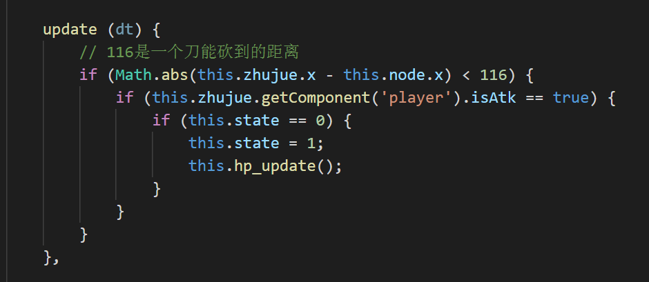然后就是随时检测主角跟自己的距离,有没有攻击。