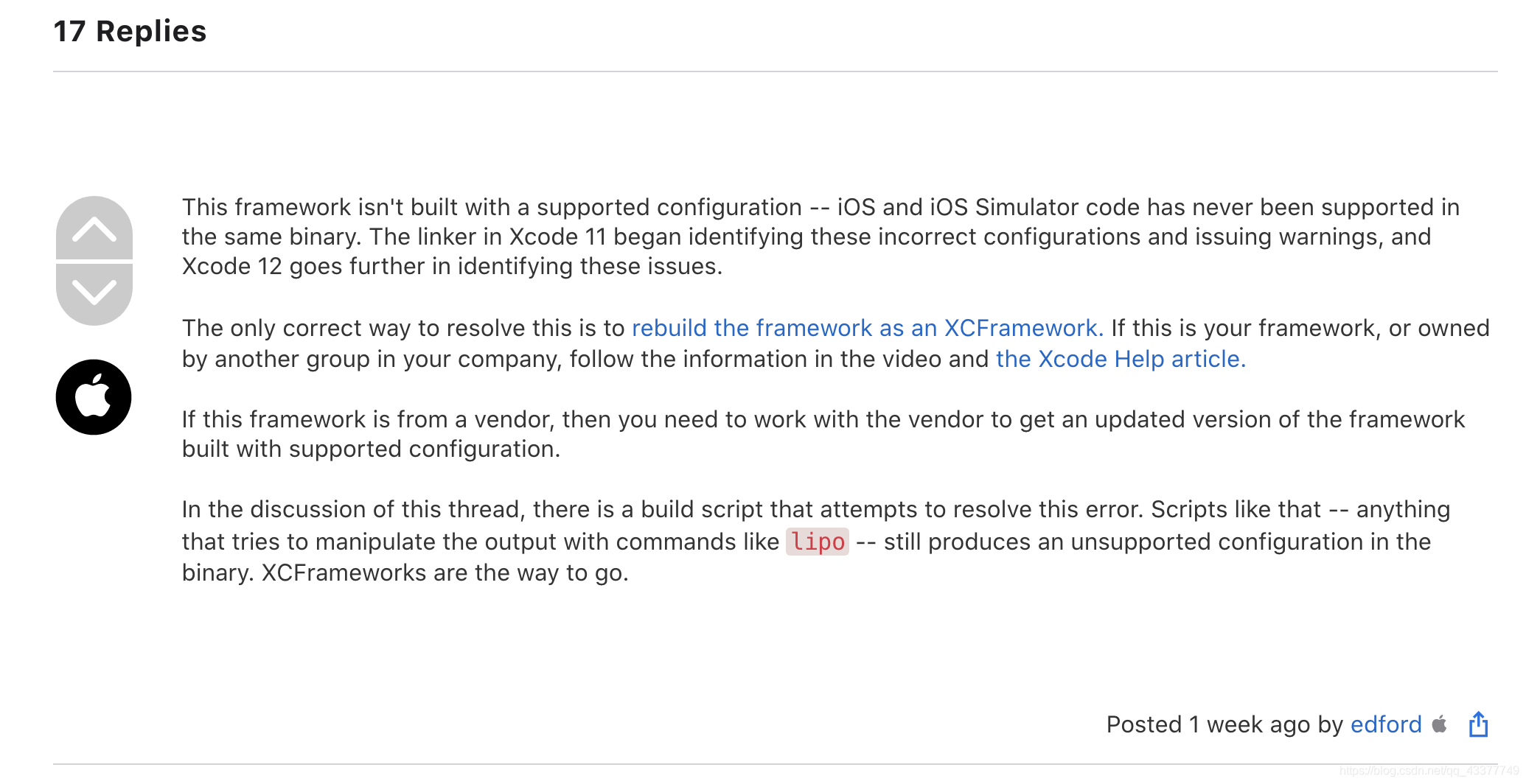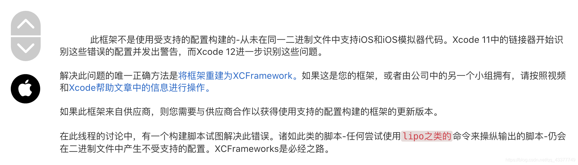 WWDC 2019推出XCFramework启,其实 XCode 11 开始就会有这个问题,但在XCode 11上一直是 warning 也就没太注意XCode12.3开始,针对类似于iOS + iOS Simulator这种多平台的包,强制使用XCFramework架构,否则error( 好坑啊 )