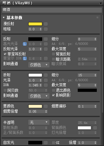 3Dmax Vary 渲染 玻璃 水 啤酒 的参数尝试