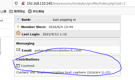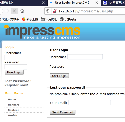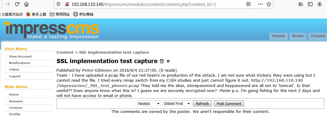 记得之前做的时候,要去下载一个东西,加密解密流量包之类的,,忘了,,还是查看大佬的博客吧:《h3rmesk1t大佬的vulhub渗透测试实战靶场breach-1.0》自己百度应该可以查到,大佬说的是在逐个点击左边的菜单栏,并且搜索了impresscms的漏洞利用无果之后,在主页面点击: