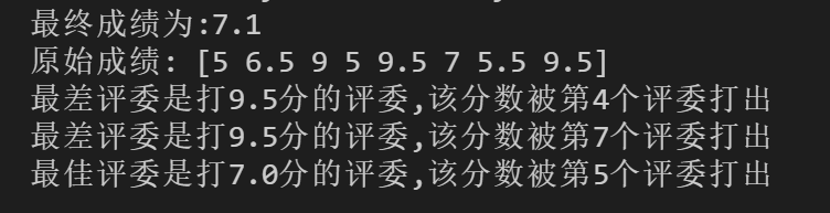 最后,在求出最差成绩和最佳成绩后,把它们拿去存放原始成绩的数组里进行比对就可以求出它们分别是第几个评委所打的分数了
