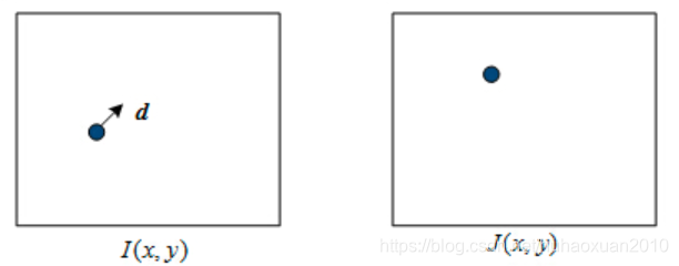 概念:如下面两帧图像I和J,存在像素点的移动,即上一帧I中蓝色像素点d在下一帧J中,其位置会有些轻微的变动,则该变动即为位移向量,也就是像素点的光流。
