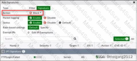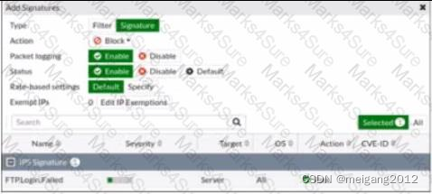 Review the Intrusion Prevention System (IPS) profile signature settings. Which statement is correct in adding the FTP.Login.Failed signature to the IPS sensor profile? 〖检查入侵防御系统(IPS)配置文件签名配置。在IPS传感器配置文件中添加FTP.Login.Failed签名时,哪一种描述是正确的?〗