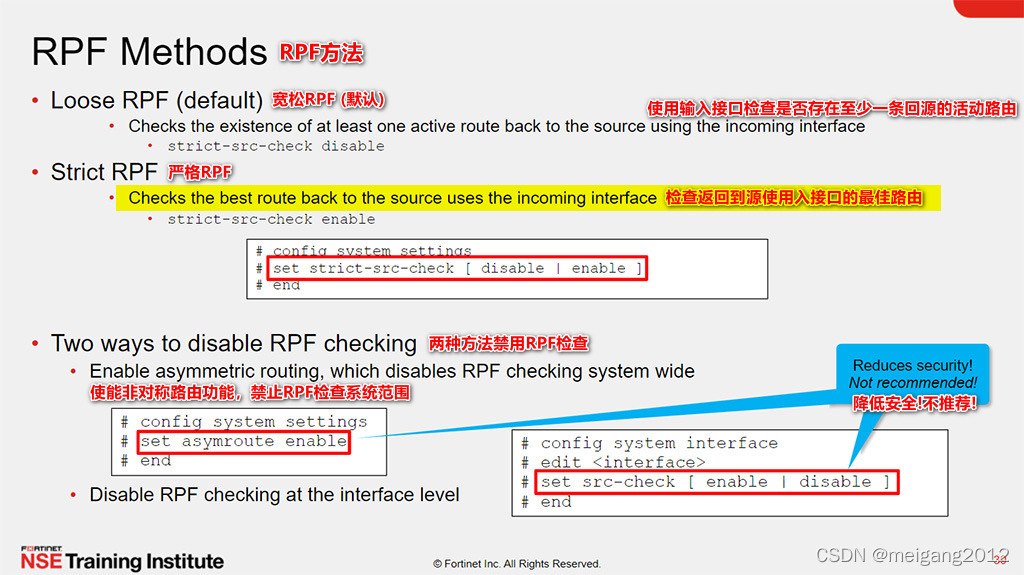 C. Strict RPF checks only for the existence of at cast one active route back to the source using the incoming interface. 〖严格的RPF只检查是否存在at cast,使用入接口返回源的活动路由。〗
