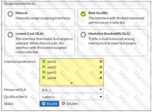 The exhibit contains the configuration for an SD-WAN Performance SLA, as well as the output of diagnose sys virtual-wan-link health-check. 〖提示包含SD-WAN性能SLA的配置,以及 diagnose sys virtual-wan-link health-check的输出。〗