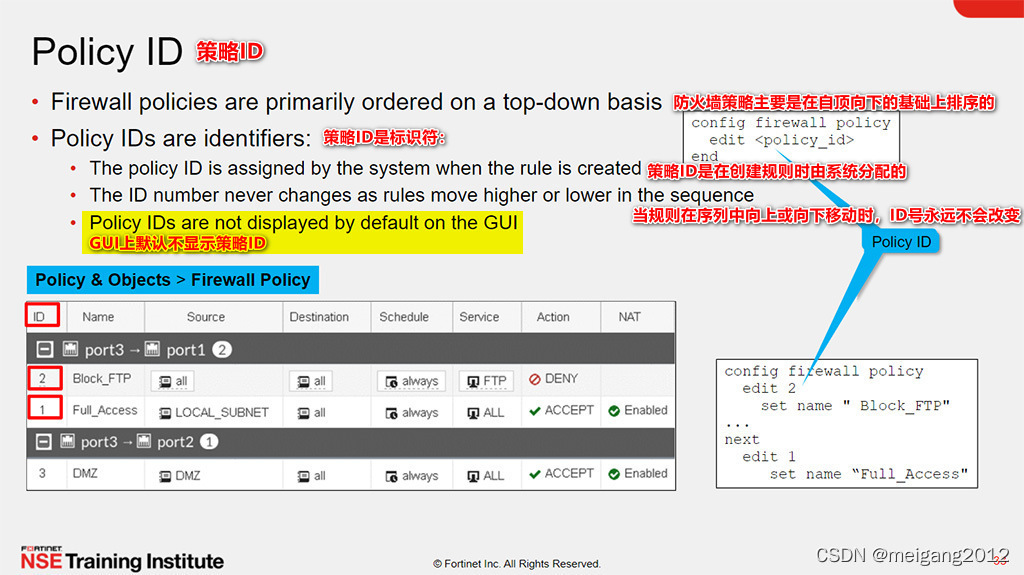 当你在GUI上创建一个新的防火墙策略时,FortiGate会自动分配一个策略ID。策略ID永远不会改变,即使你将规则在序列中移动得更高或更低。