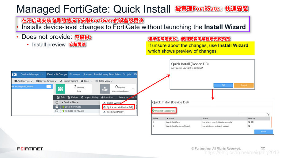 D. When run on managed devices directly, you can install changes to the managed FortiGate devices using the installation wizard. 〖当直接在被管理设备上运行时,你可以使用安装向导安装对被管理FortiGate设备的更改。〗