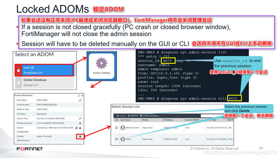 当ADOM被锁定时,如果遇到FortiManager的连接意外关闭(PC崩溃或浏览器关闭),它将保持锁定状态,直到管理员会话超时或会话被删除。管理员可以通过GUl或CLI方式删除会话。删除前一个会话后,ADOM将立即解锁。