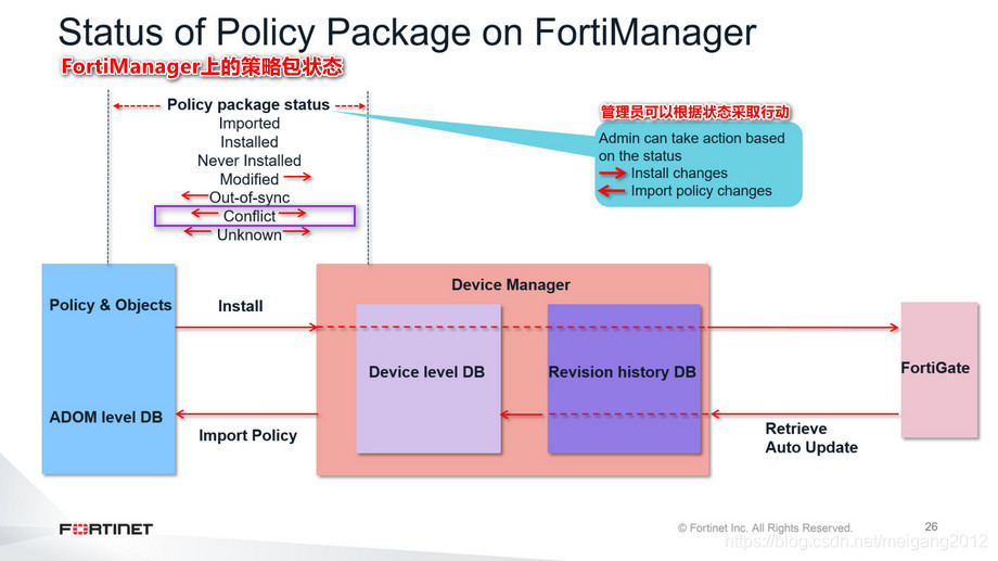 冲突:如果你在FortiGate上进行了本地策略配置更改,但没有将更改导入到策略包中,并且你也在FortiManager上进行了更改,则状态将进入冲突状态。根据配置更改,你可以导入策略包或从FortiManager安装更改。