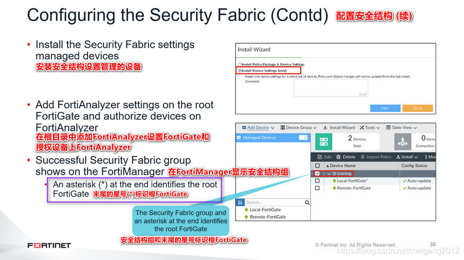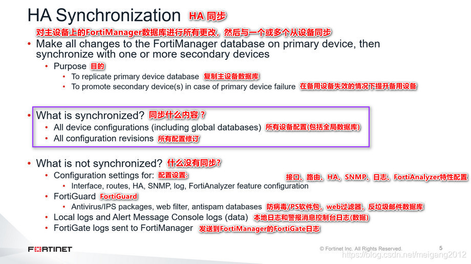 有一些配置设置、FortiGuard数据库和日志没有在主设备和从设备之间同步。FortiGuard数据库和软件包是单独下载的,每个设备都可以为被管理的设备提供FortiGuard服务。
