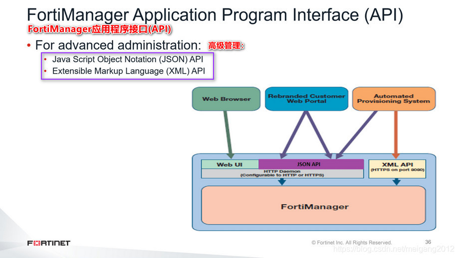 如果你想使用API来监视你的系统,或者使用第三方设备来设置或获取数据,你可以使用JSON和XML API。FortiManager API是一个非常强大的工具,它向客户提供管理web门户、自动部署和供应系统。
