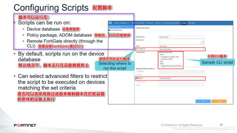 ● Remote FortiGate Directly(通过CLI):脚本可以直接在设备上执行,不需要使用安装向导安装更改。由于更改直接安装在被管理设备上,因此在执行配置更改之前,不提供通过FortiManager验证和检查配置更改的选项。