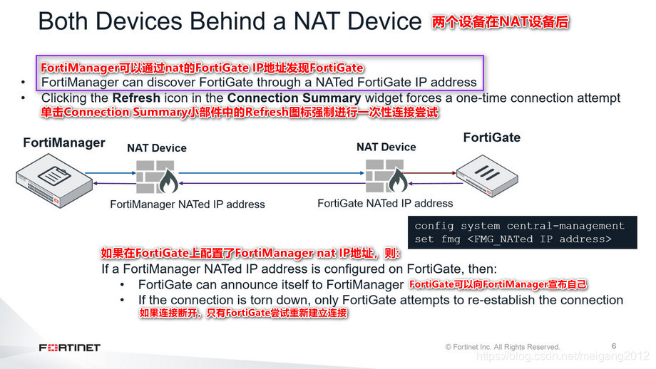 如果两个设备(FortiManager和FortiGate)都位于NAT设备后面,FortiManager通过FortiGate nat IP地址发现FortiGate设备。就像在NAT后的FortiManager场景中一样,这个场景中的FortiManager NAT IP地址不是在FortiGate中央管理配置下配置的。如果FGFM隧道中断,FortiManager将不会尝试重新建立到FortiGate nat地址的FGFM隧道。如果在中央管理配置下在FortiGate上配置了FortiManager nat IP地址,如果被拆除,FortiGate会尝试重新建立fgffm隧道。