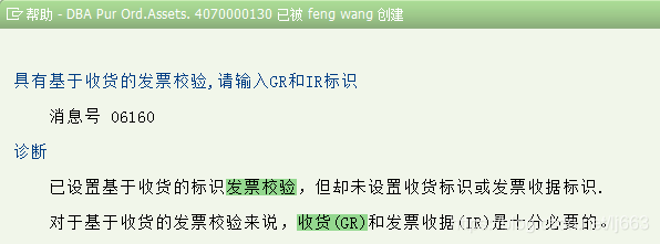 如下图,当采购订单中不勾选收货或发票校验时,“基于收货的发票校验”的勾选就会报错。