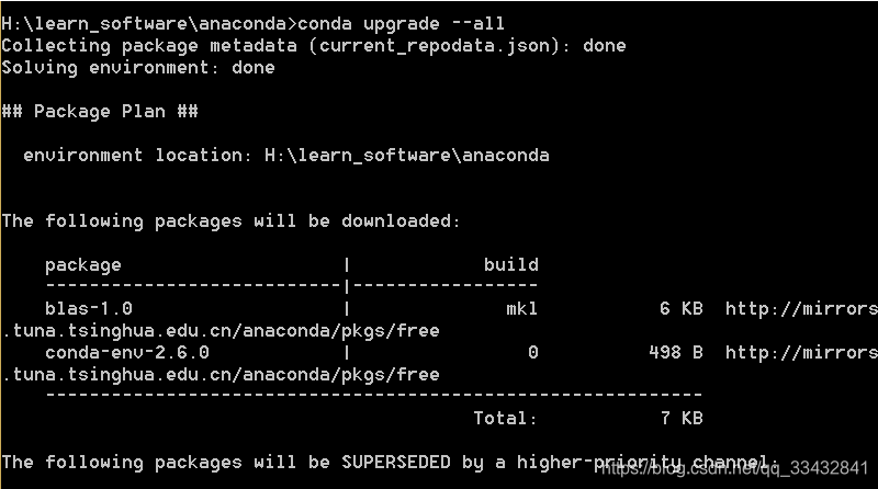 然后在运行 conda upgrade --all 这个命令。就可以更新成功了。如下图所示: