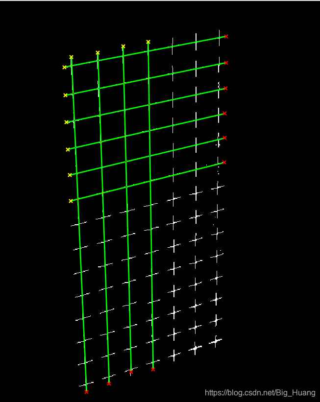 for k = 1 : 4 % 希望的列数xy = [columns(I(k, 1)).point1, columns(I(k, 1)).point2];plot([xy(1,1), xy(1, 3)],[xy(1,2), xy(1,4)],'LineWidth',2,'Color','green');%画出线段plot(xy(1,1),xy(1,2),'x','LineWidth',2,'Color','yellow');%起点plot(xy(1,3),xy(1,4),'x','LineWidth',2,'Color','red');%终点column_line = [column_line; xy]; %[startX startY endX endY]
