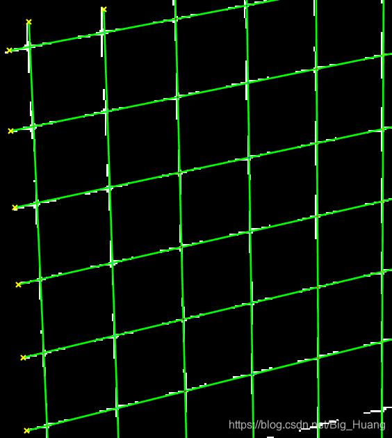 for k = 1 : 6 % 希望的行数xy = [rows(I(k, 2)).point1, rows(I(k, 2)).point2];plot([xy(1,1), xy(1, 3)], [xy(1,2), xy(1,4)], 'LineWidth', 2, 'Color', 'green');%画出线段plot(xy(1,1), xy(1,2), 'x', 'LineWidth', 2, 'Color', 'yellow');%起点plot(xy(1,3), xy(1,4), 'x', 'LineWidth', 2, 'Color', 'red');%终点row_line = [row_line; xy]; %[startX startY endX endY]