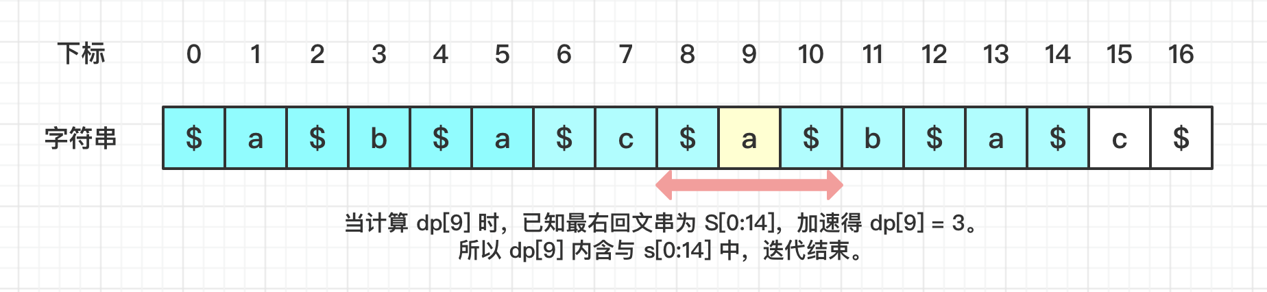 - 同时,由中心对称得出的 dp[i] 也不能比 dp[i_mirror] 更大。如果超过了,也无法保证 dp[i] 的有效性了。